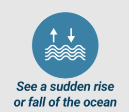 see the water draw out to sea quickly and unexpectedly from a beach exposing the ocean floor (the so-called drawback) or a sudden rise of the sea level, escape immediately to higher ground or inland (avoiding river valleys). If you are in a tsunami zone marked by signs, follow posted signs to a safe area.